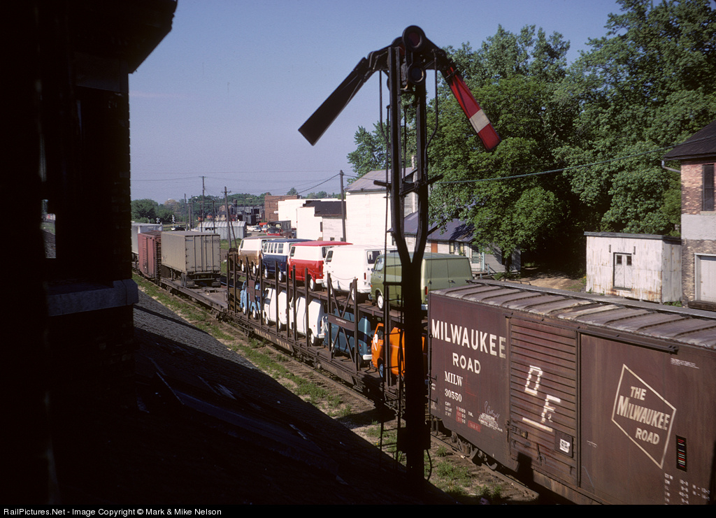 | Tonnage moves past the old order board at the J'ville depot, including a rack of fresh Chevy vans from the nearby GM plant. Perhaps they inspired recording artist Sammy Johns 6 years later to sing about the fun one could have "making love in a Chevy van"? Click on "CNW 911" above for the series of shots of this train's passage. |