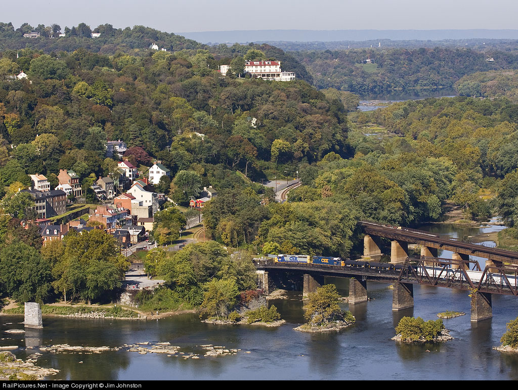 | The Winchester Local makes its way to "the Valley" on the Shenandoah Sub crossing the Potomac River from Maryland towards Virginia it passes by historic Harpers Ferry, WV on a beautiful Autumn mroning. |