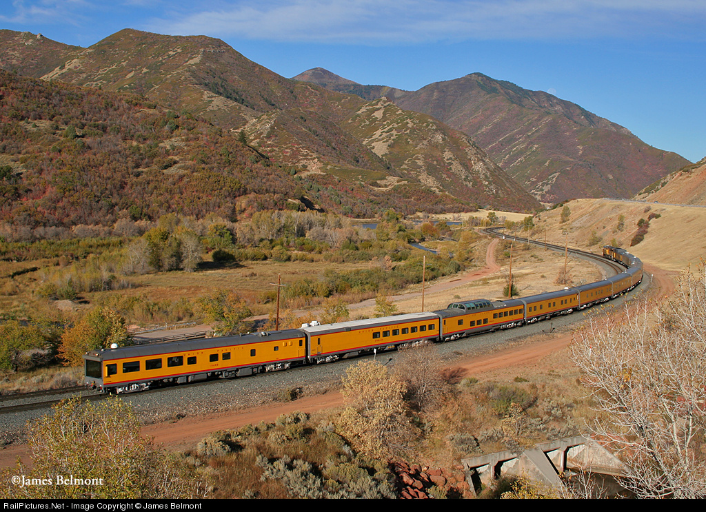 | A Union Pacific passenger special crosses Diamond Fork in Utah's Spanish Fork Canyon. The executive special ran between Denver, Colorado and Council Bluffs, Iowa (via Salt Lake City and Ogden). UP theater car "Idaho" trails the passenger train down the canyon. |