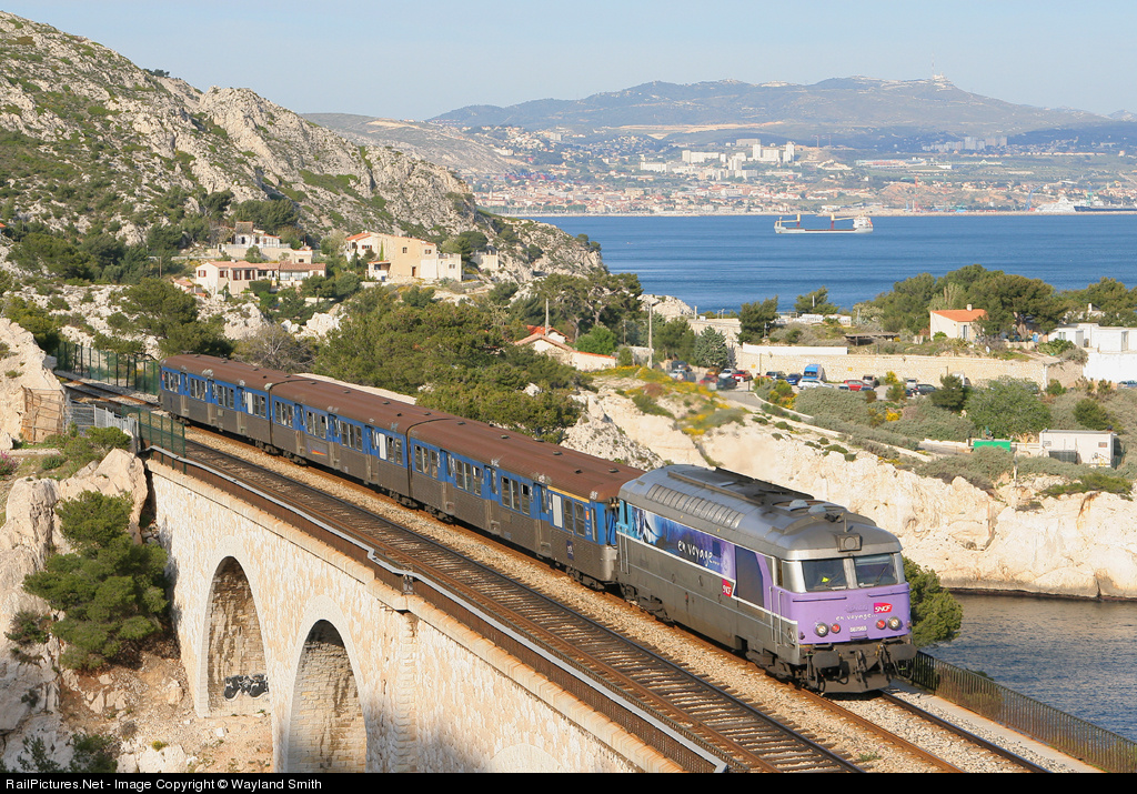En Voyage (like the photographer!) liveried SNCF Class 67 leading a push pull working from Marseille to Miramas crossing the viaduct west of Niolon, with a Miramas bound service.
