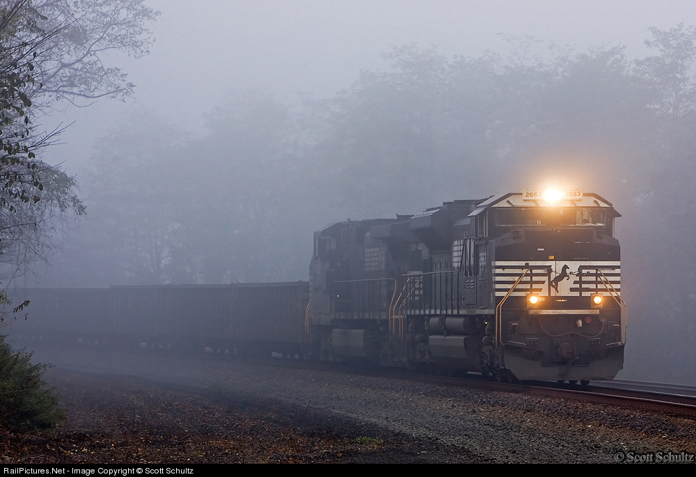 NS engine 2663 leads a mty slab train, by Leshville Road in heavy fog.