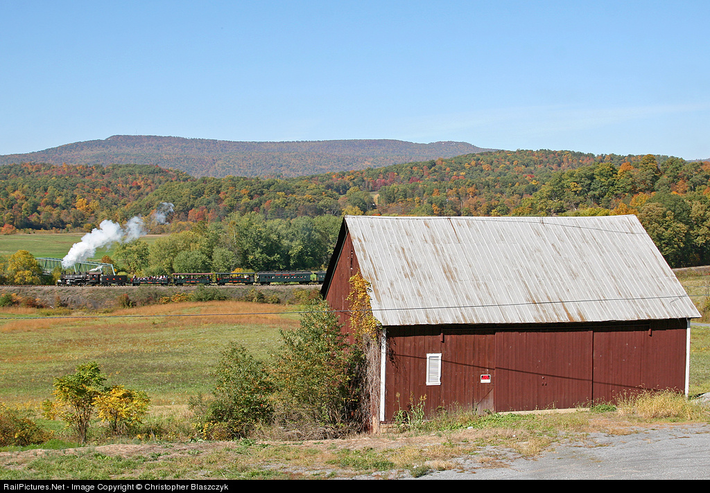 | With the barn right up against the highway and the train and Aughwick Creek bridge in the distance, it takes a creative angle to include the whole scene. Luckily, no one was parked in the lot in front of the barn. Thanks to the crew for the smoke as EBT 15 drifts downgrade. |