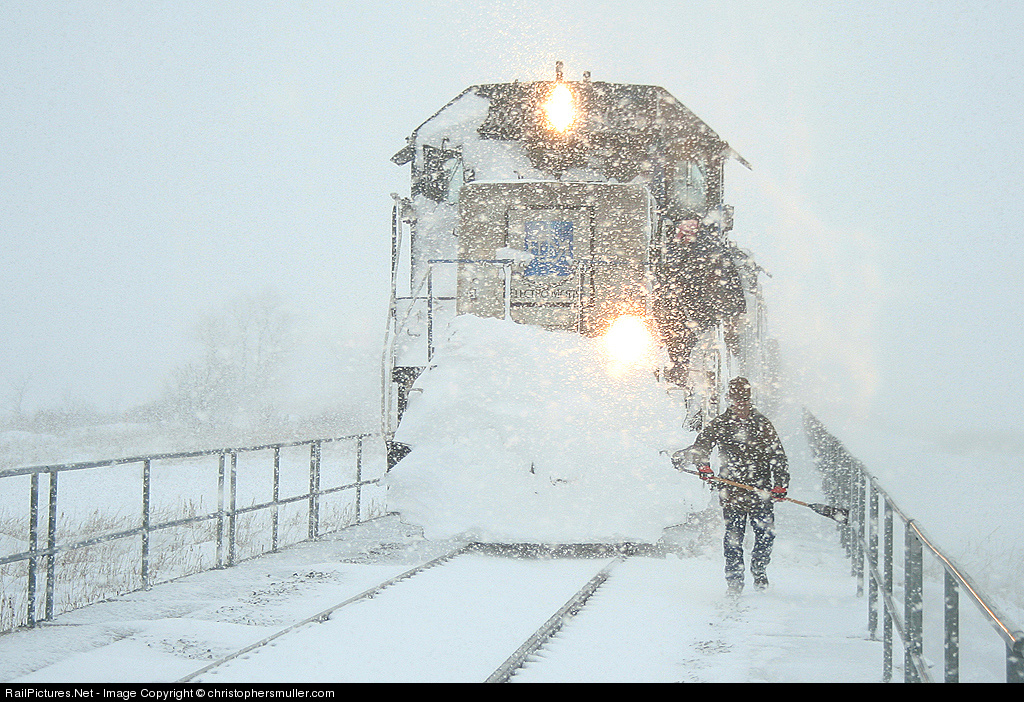 April 6th, 2008 is a day I will never forget. Half of this crew's battle was just getting out of the cab. The SD60 almost looks like a monster coming out of the great unknown. With a single day snowfall total of 27 inches on Sunday alone... and a storm total of over 33 inches over two days, this is the single heaviest snow event I've ever witnessed. The crew was awesome in letting me photograph their amazing battle to get the train to Cass Lake. There is a hi-rail truck stuck in a four foot snow drift right behind me, the crew of the train is going to assist him in clearing a switch so they can meet their counter-part the M-MINSUP in the yard. The EMD Oakway SD60's are quite low on my preference list for power, it just so happened the two trains I saw on this day BOTH had a pair of these faded blue and white beasts. Going through these older photos makes me eager for winter. Full story and video here.