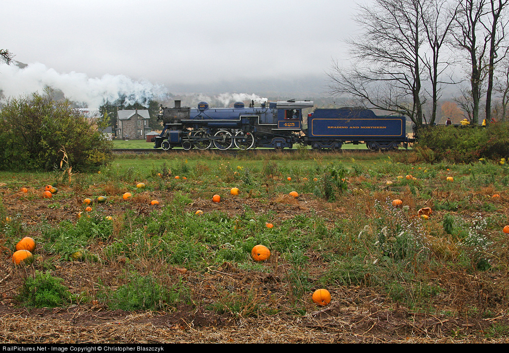 | Happy Halloween. After performing a few runbys at the wye, Reading & Northern back the special excursion to Jim Thorpe, passing this pumpkin patch in Haucks. Note the low-hanging clouds obscuring the hills in the background. |