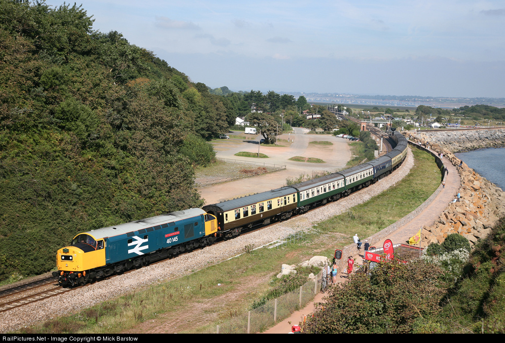| Class 40 number 40145 is seen passing Langstone Rock, near Dawlish, Devon with a Banbury to Kingswear charter. |