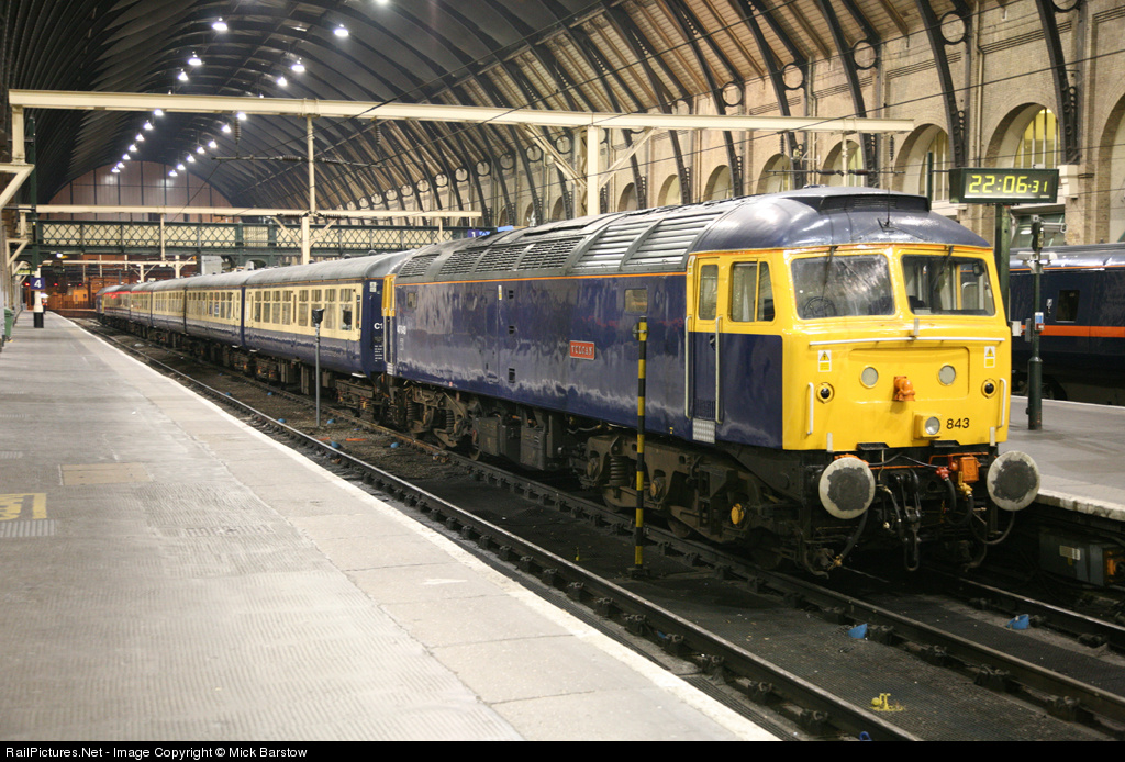 Class 47 number 47843 is seen at London Kings Cross after arriving with a return charter from Carlisle.
