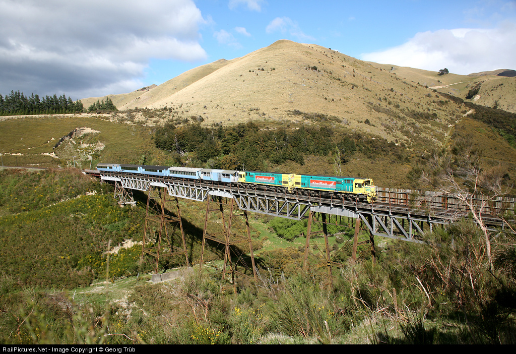 | Instead of the damaged steamlocomotive Jb 1236, two DX diesel are in front of Mainline Steam's charter from Christchurch to Arthur's Pass. The locomotives, still in the Toll Rail colors but with new KiwiRail lettering, are seen on the 37 m high Patterson's creek viaduct of the midland line. |