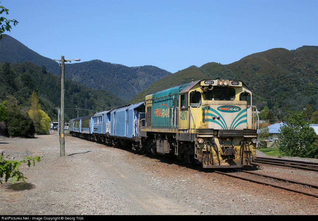Trains on 3' 6" (1.067m) track from Whangarei to Bluff with virtually heritage rebuilt EMD and GE locomotives still the mainstay power. The network was privatized in 1990's and operated by Toll until 2008 when state owned KiwiRail was established.