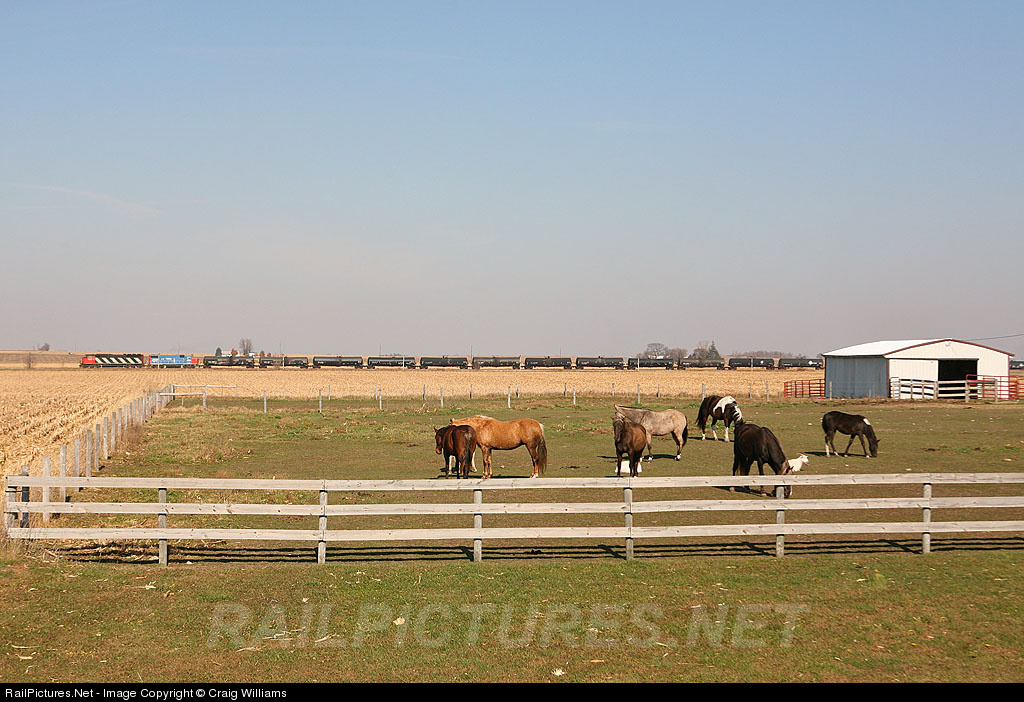 Westbound M337 is only 13 miles from its final destination of Waterloo. A SD60 and a GP 38 power this 114 car train pass some horses along old highway 20. This train runs daily between Chicago, IL and Waterloo, IA a total of 300 miles.