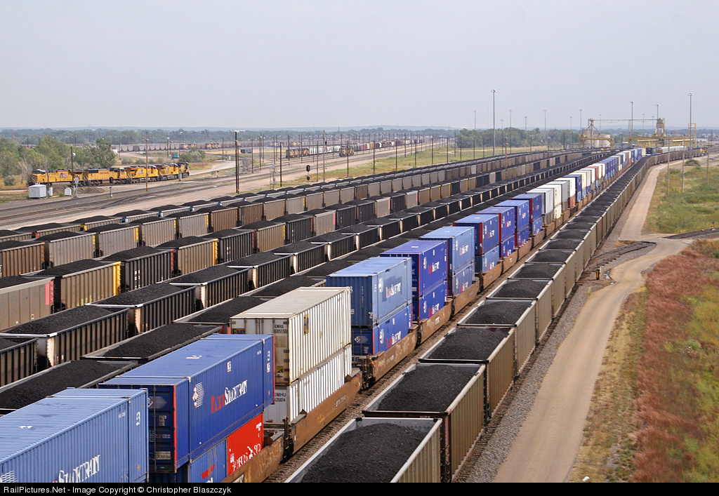 | The loneliest stack train. As the tour buses crossed the flyover, the east run through tracks are packed with loaded coal trains...and one stack train. In the background, ES44AC 5269 and four sisters head toward the westbound departure tracks and the south pull tracks. |