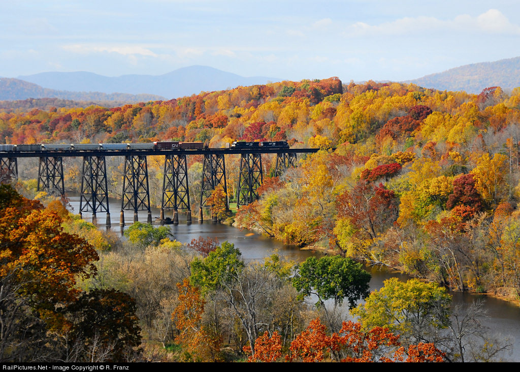 Crossing the James River trestle on a beautiful fall day with the colorful Blue Ridge foothills in the distance.