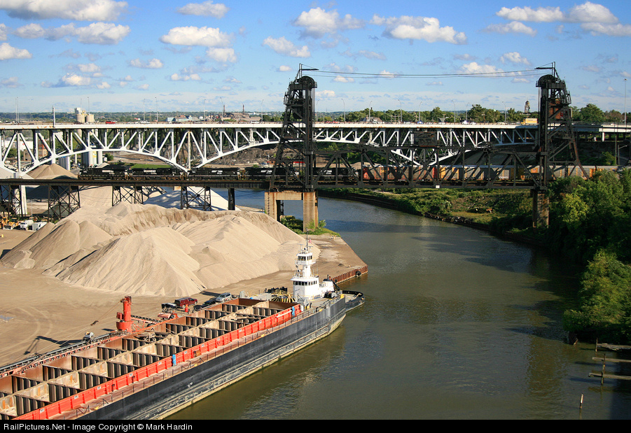 | An eastbound manifest crosses the Cuyahoga River and the Cleveland Flats with plenty of power on the old NKP on its way from Bellevue, Ohio toward NS's Bison Yard in Buffalo, New York. |