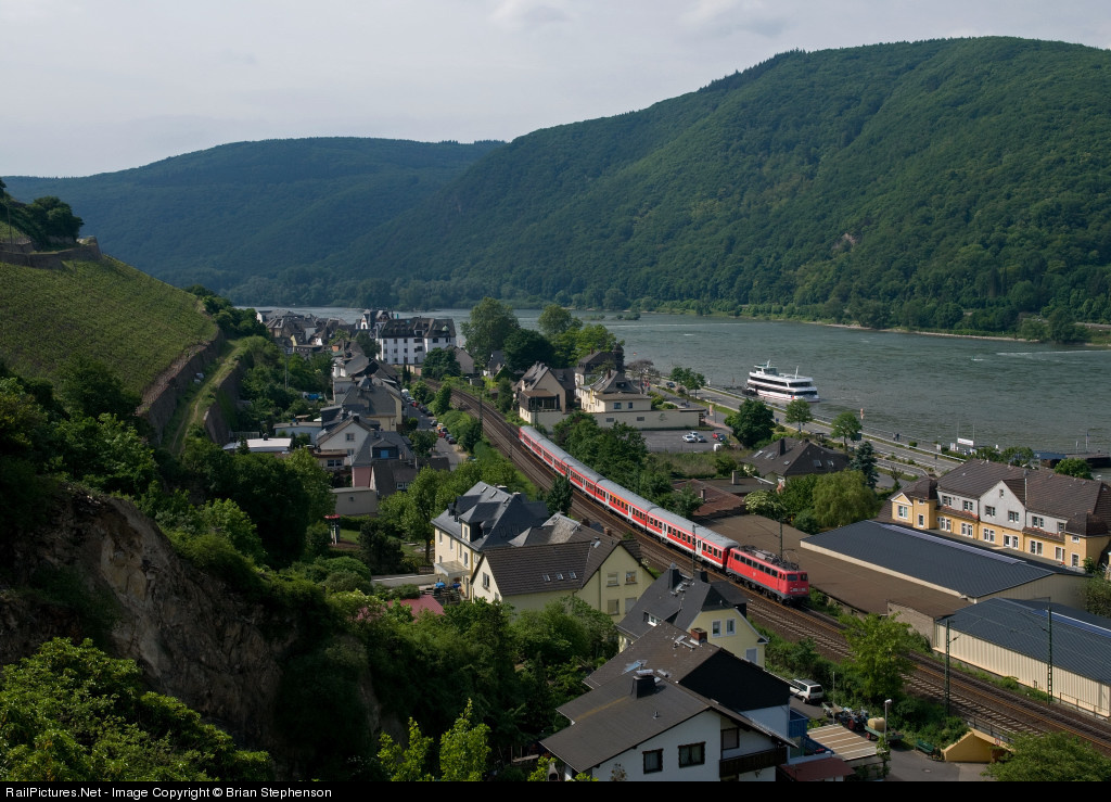 | A morning Koblenz to Frankfurt local approaches Assmannshausen on the River Rhine propelled by a class 110 Bo-Bo electric. These former express locos first introduced in 1957 (this one dating from 1966) are soon to lose their last duties on this scenic route and will probably head for Bender's scrap yard. |