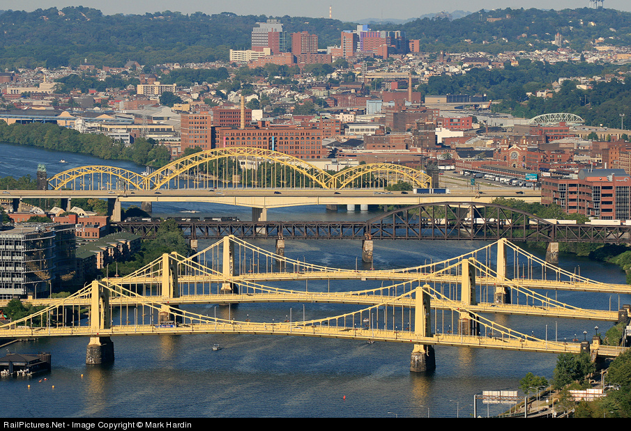 Looking at this view up The Allegheny River you can see how Pittsburgh got its nickname, "The City of Bridges". Note, the westbound intermodal crossing NS's Fort Wayne Line Bridge.