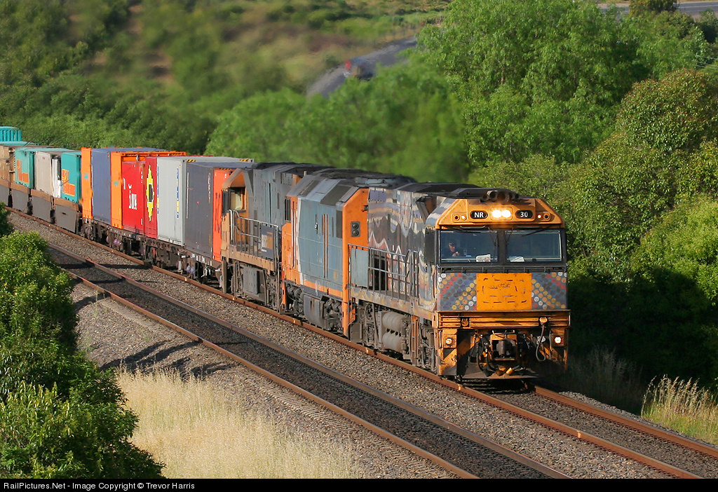 NR30 Adorned in the Aboriginal scheme looking worse for wear as it leads DL44 and NR12 on a PacNat intermodal.