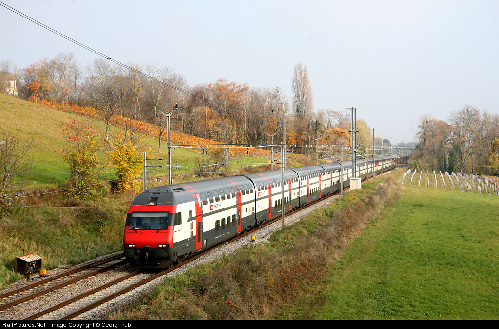 When the doubledeck Intercity coaches "IC 2000" were introduced 10 years ago, they ran as 8 car trains at the most. Today it is not uncommon to see trains with up to 12 cars with a capacity of about 1200 seats. IC 720 with the cabcar in front and locomotive Re 460 shoving is travelling through the vineyards on the shore of Lake Geneva.
