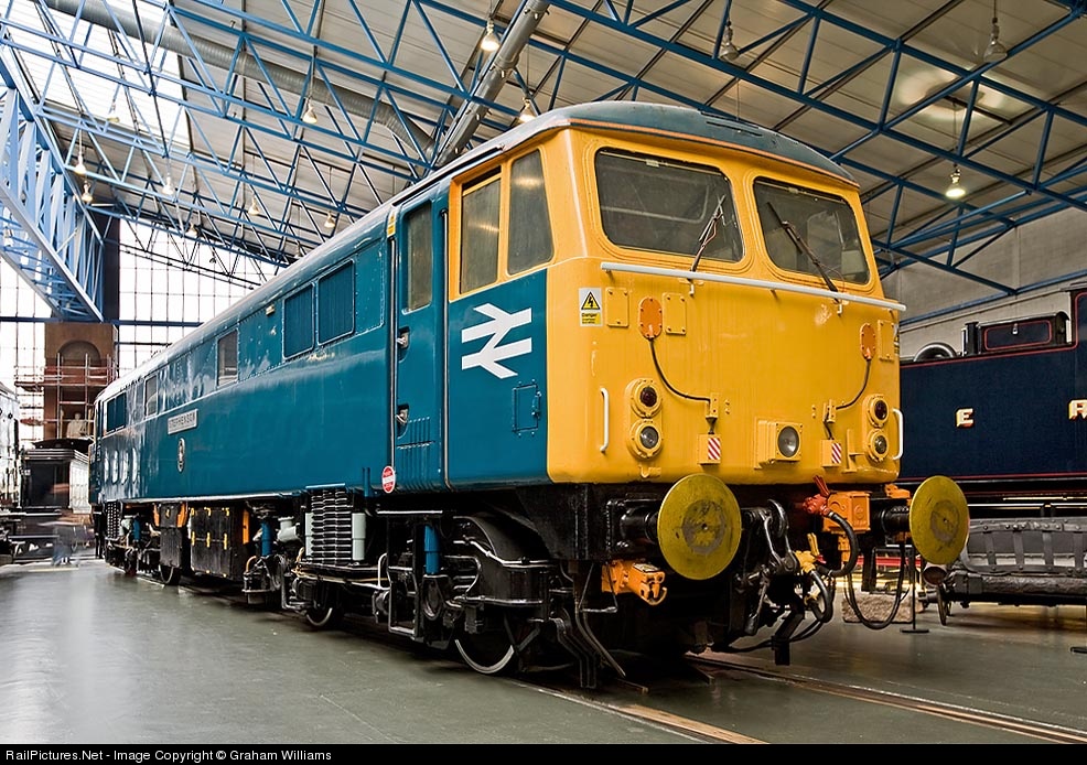 | Class 87 no. 87 001 on display at the National Railway Museum, York. The class was introduced in 1973, for the completion of the electrification of the northern section of the West Coast main line between Weaver Junction and Glasgow. They were the mainstay of these express services until the Virgin Pendolinos were introduced in 2002. The last ones were withdrawn from service at the end of 2007. A few were scrapped, four were preserved including this one and one that has been re-certified for main line use, the remainder have been sold for further use in Bulgaria. The loco carries the name STEPHENSON on one side and ROYAL SCOT on the other. The loco carried both names at different times in its career. |