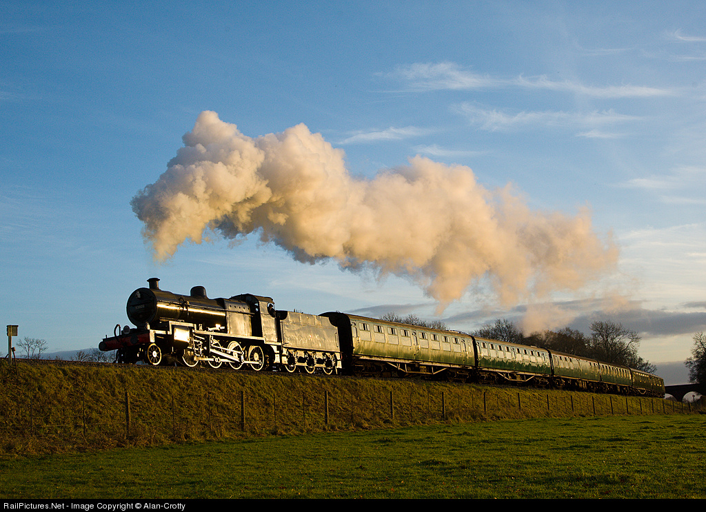 Somerset & Dorset 2-8-0 is bathed in evening sunshine as it storms up the last few yards of the gradient into Horsted Keynes. The locomotive is visiting the Bluebel Railway from it's usual base at the Midland Railway Centre.