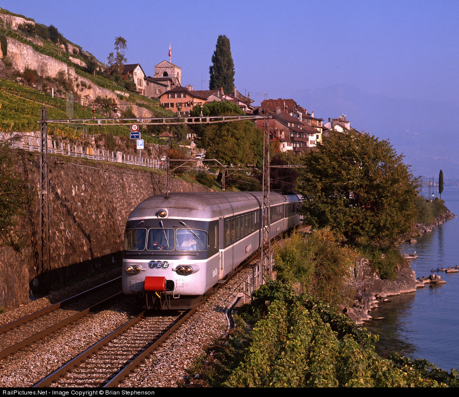 A Swiss Federal Railway former TEE four-voltage unit now in Euro-City colours has just passed St.Saphorin beside Lac du Leman (Lake Geneva) on the 14.00 Milan to Lausanne service. One of these iconic trains survives restored to the red and cream TEE livery.