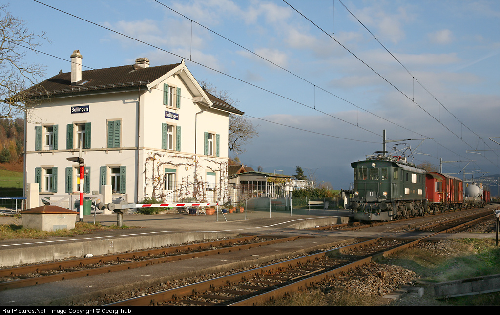 | A short freight with the former Bodensee-Toggenburg-Bahn locomotive Be 4/4 15 is waiting for a passing train in the little station of Bollingen. On the right of the station building there is a signalbox with the two signalbells in front. The purpose of this train from Glarus to Bauma via Uznach-Rapperswil was training an engine driver. |