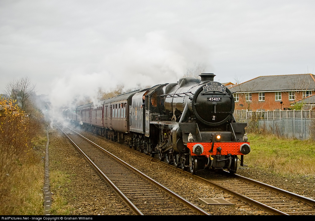 | Black Five no. 45407 passes Moses Gate, Bolton on the final leg of the Cotton Mill Express main line special. This well patronised special service has been running successfully once a month throughout 2008 and is scheduled to continue in 2009. |