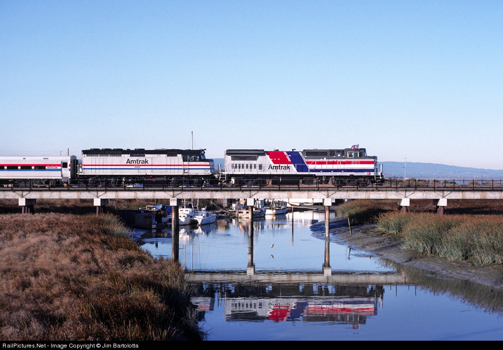 | Inaugural Capitol (San Jose - Oakland - Sacramento), crossing the Guadalupe River in the early morning. This was also the service debut of the P32 and Pepsi can scheme. I had an invite to ride the train, but also a job to get to! |