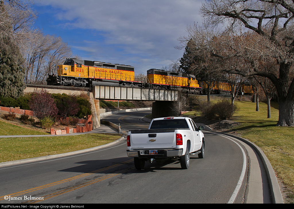 A fabulous quad of EMD SD40-2's (all of them UP originals) lead the world famous "Dirt Train" across the old Main Street girder bridge at West Price, Utah. The lead motor, UP 3121, was built the UP 3774 in October 1980 and was renumbered to clear the roster for a new SD70M on March 27, 2004.