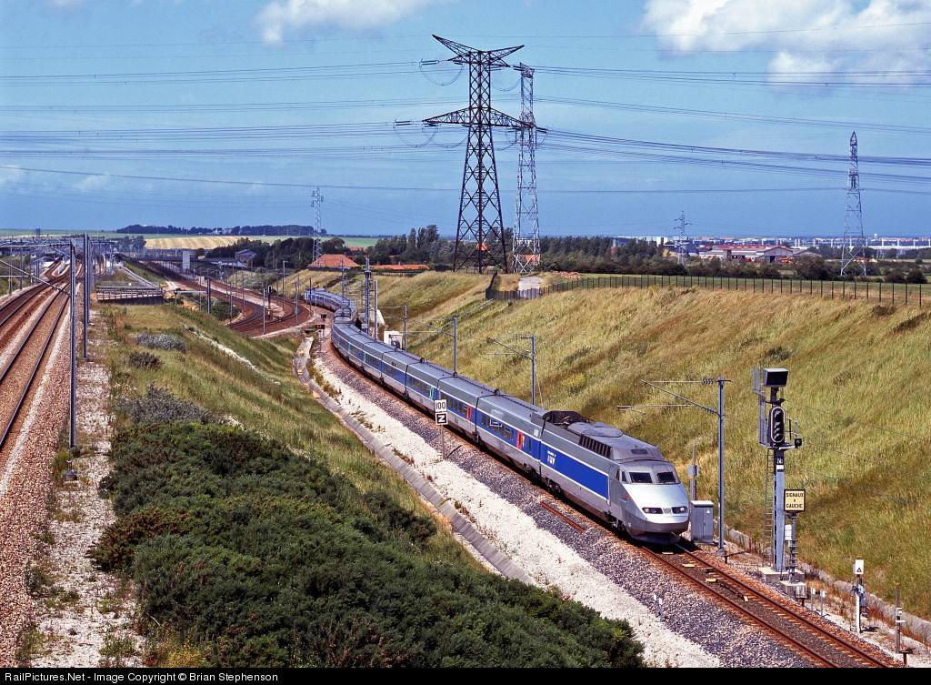 | The 12.51 TGV service from Calais Ville to Paris Nord comes up the connecting spur from Calais-Frethun station to the LGV (high speed) line formed of a pair of former Paris-Sud Est TGV units. The line on the left is the high speed line heading straight for the Channel Tunnel and England. The sea lies just beyond the hills in the distance. |
