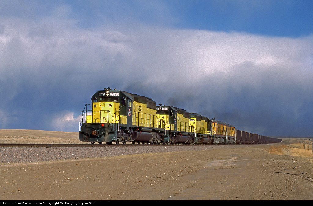 Coming off the renovated portion of the CNW "Cowboy", about to turn north and head to the Powder River with empty coal hoppers, 2 CNW SD40-2s and 2 UP U30Cs poke in and out of typical-for-the-season snow showers, Those showers will move through and dump 1-2 inches in a short time. Oh yeah the wind is howling, but that's normal.