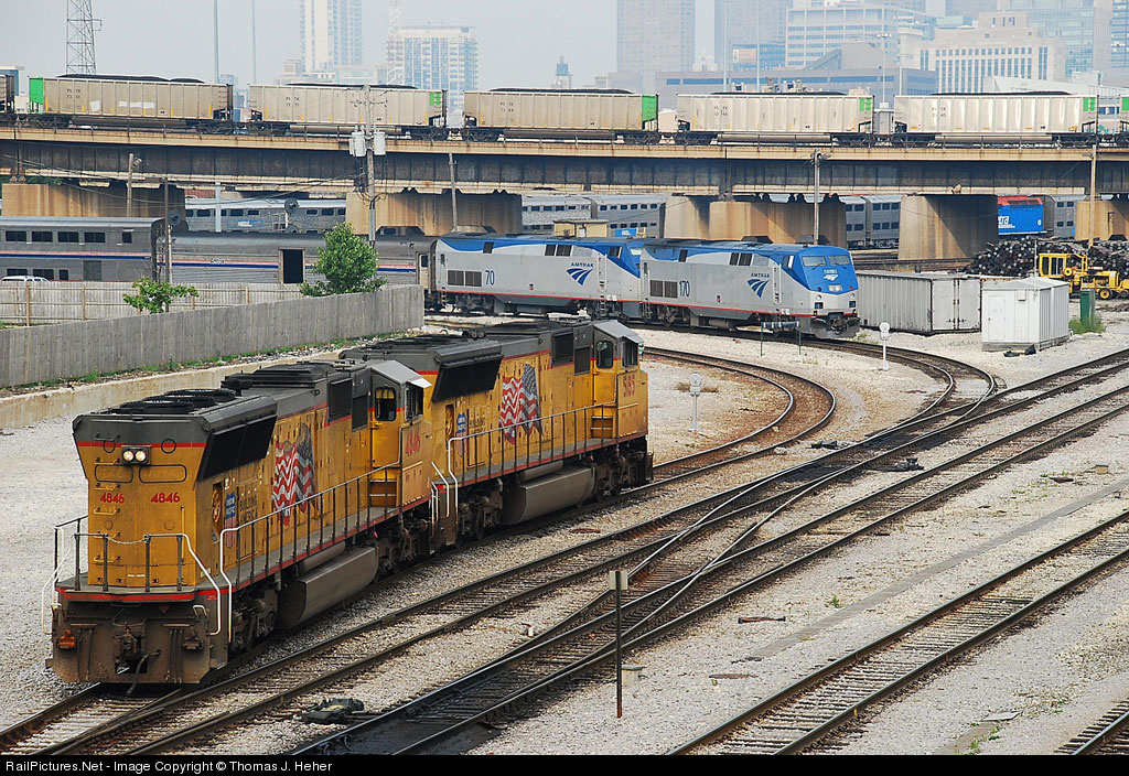 | Amtrak #5 waits its turn to take the Y to head for Union Station as UP light power heads for the UP Western Ave Intermodal Facility. Overhead a BNSF coal train for the CN and Midwest Generations heads over the top on the St. Charles Air Line. |