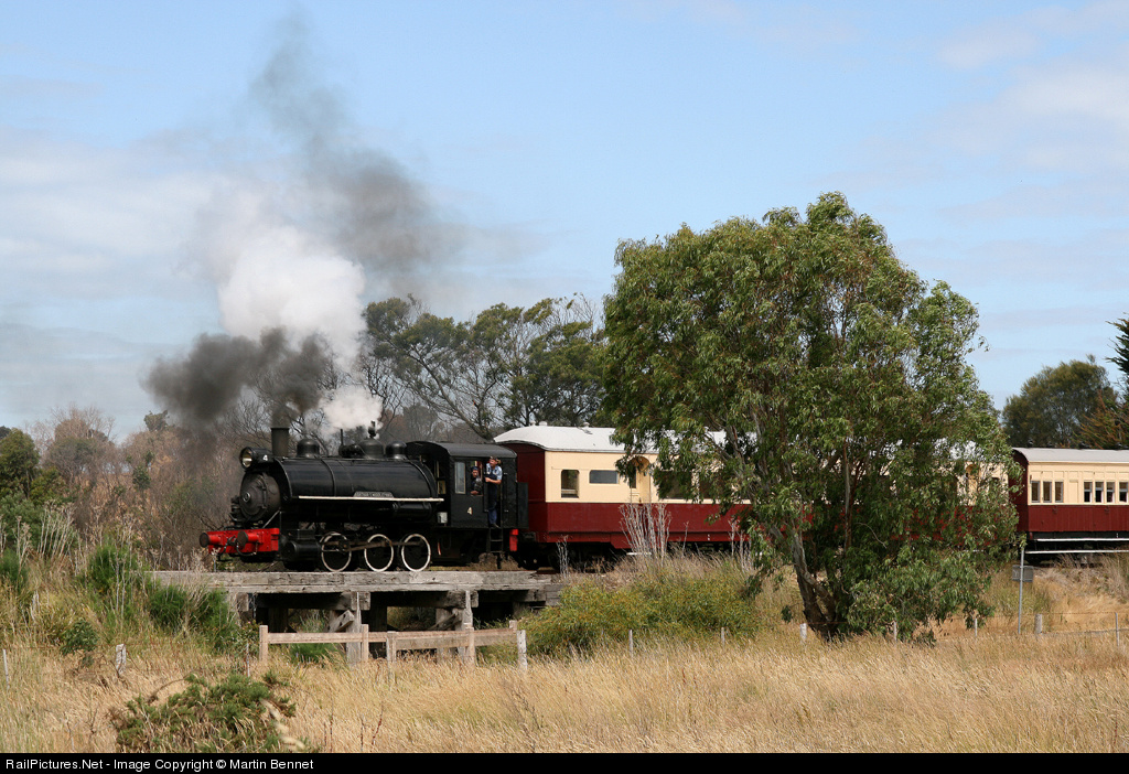 Vulcan No.4 climbs up grade across a short trestle between Queenscliff and Drysdale, as her fireman leans out to look for cars at a busy crossing ahead. No.4 originally worked on an industrial railway in nearby Geelong, and is now used on the 3'6" Bellarine Peninsular Railway, a former Victorian Railways 5'3" line.