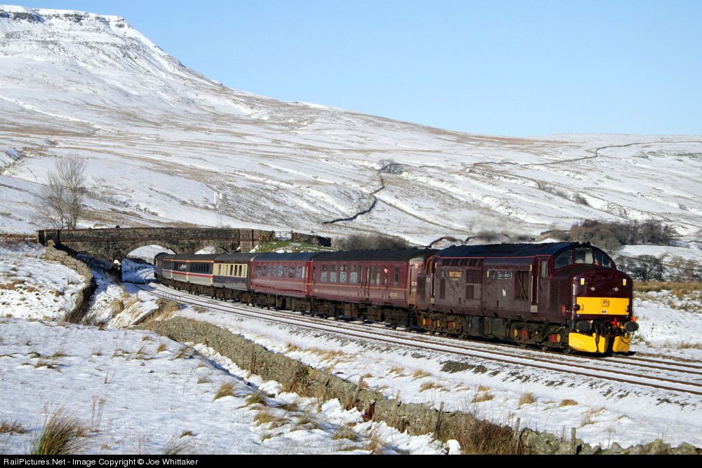 | West coast railways 37676 passes a snow covered wild boar fell as it reaches the top of Ais gill bank with a southbound excursion. |