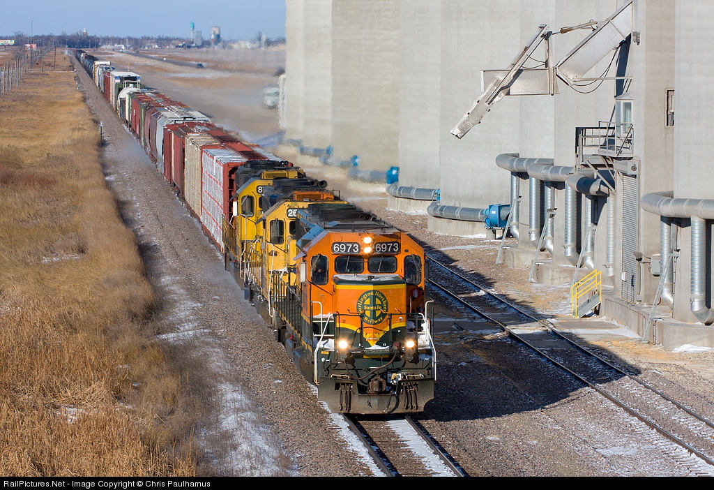 EMD fans rejoice! A trio of EMD classics, led by forty year old BNSF 6973, hustles the daily Grand Forks, ND - Northtown, MN high priority manifest south past the grain facility in Alton. How many GE products in their fifth decade of existence do you see leading mainline freight these days? More info at Grand Forks Railfanning.