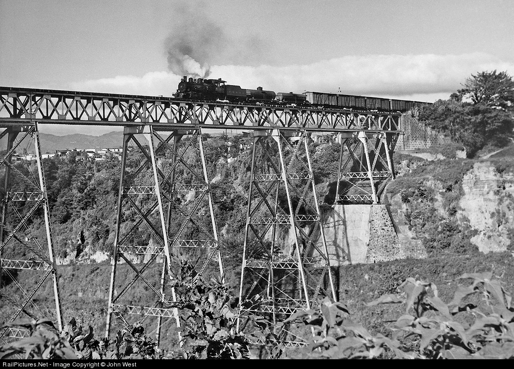 A Puerto Barrios bound train departs Guatemala City over the impressive "Viaduct of the Cows", the highest and longest bridge of the many impressive bridges on the scenic three foot gauge former International Railways of Central America line. Not sure I would want to be the guy riding the roof of the second boxcar. Sad that Henry Posner's recent effort to keep this line open was a casualty of local corruption and greed.