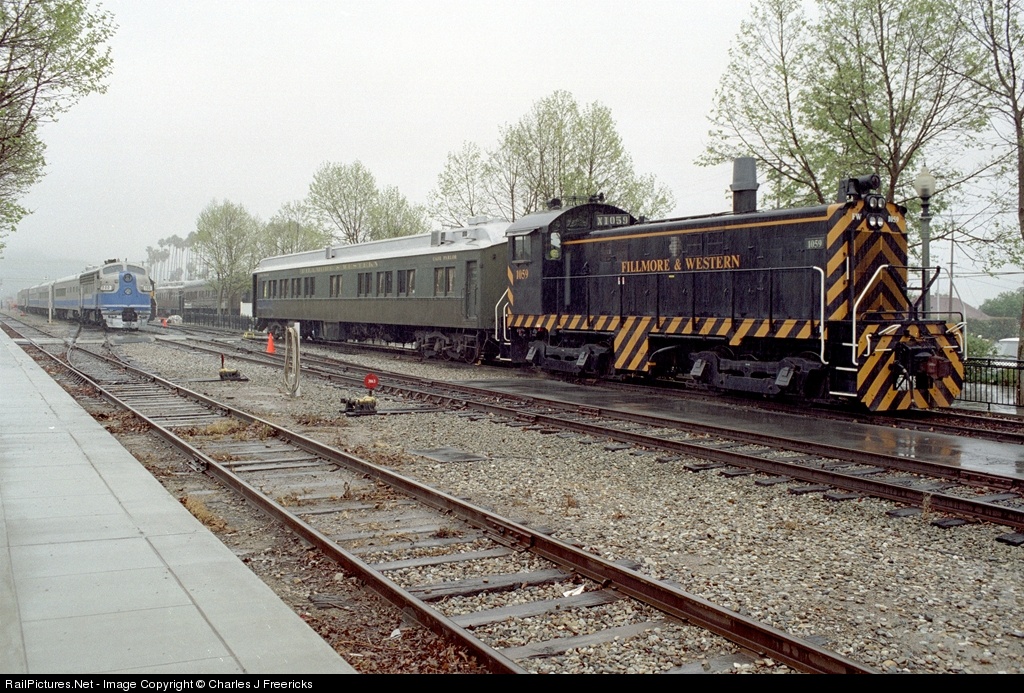 Santa Clara River Valley Railroad Historical Society's Railfest 2005 was held even though the skies opened up with a downpour. The railroad put a lot of equipment on display between the Southern Pacific's old wood frame depot and the town's large city hall. S6 #1059 may have worked this line back when it was still Southern Pacific's Santa Paula Branch, as the end-cab ALCO was originally SP #1059, delivered in July of 1956. Renumbered to #1226, it was sold to the Ventura Country Railroad, where it became #9, and worked not too far from here between Oxnard and Port Hueneme.