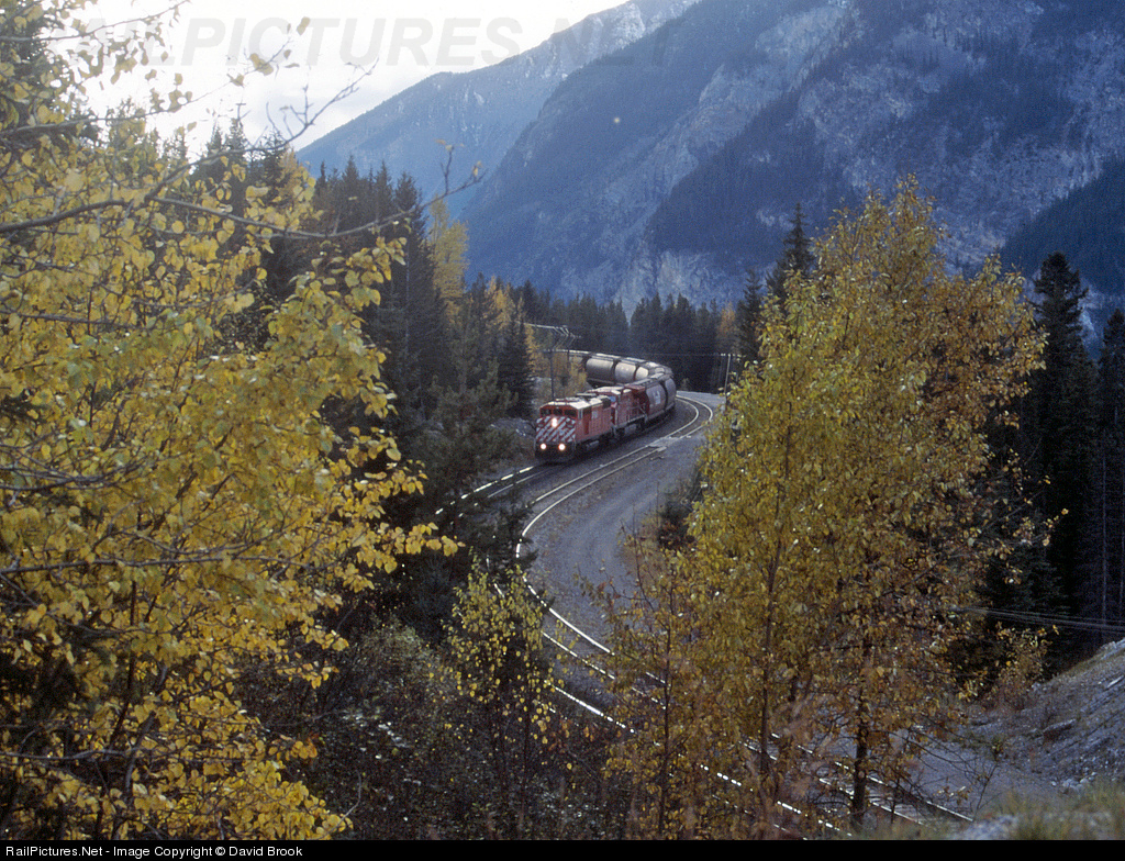| It's late afternoon as 9020 drops down through Yoho with a unit grain train. The tail end is still winding out of the upper spiral tunnel ata steady 20 mph. When the GE's first came on stream, there were problems with the remote controls so for a brief period, GM's held on to the role of leaders for the last time |