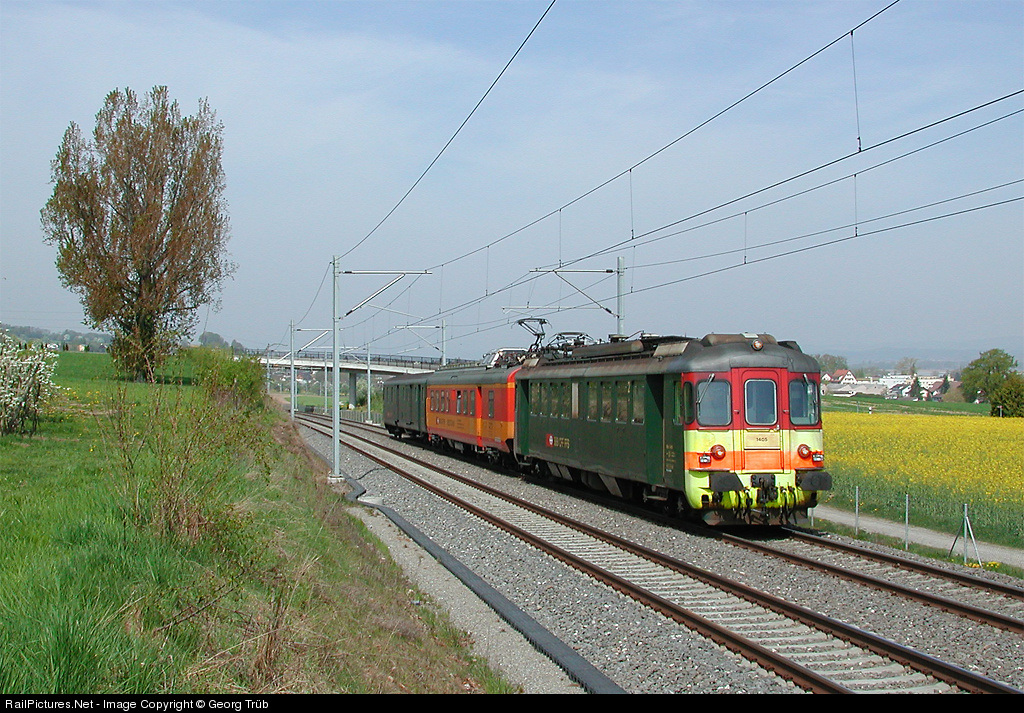 | Electric railcar RBe 4/4 with a test train for measuring the overhead wire, on the rear a baggage cab car. The power for the RBe 4/4 comes via the pantograph of the measuring car via cable connection. The train is on the then new doubletrack line between Kreuzlingen and Kreuzlingen Bernrain of the former Mittel-Thurgau-Bahn. RBe 4/4 1405 is operational today for the Draisinen Sammlung Fricktal (DSF) in Koblenz. |