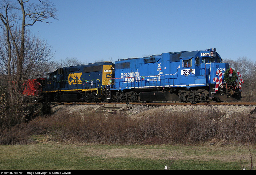| Still in Conrail Blue and sporting its Operation Lifesaver paint scheme, NS 5290 leads the Browns Yard Santa Train through Monmouth Battlefield State Park. |