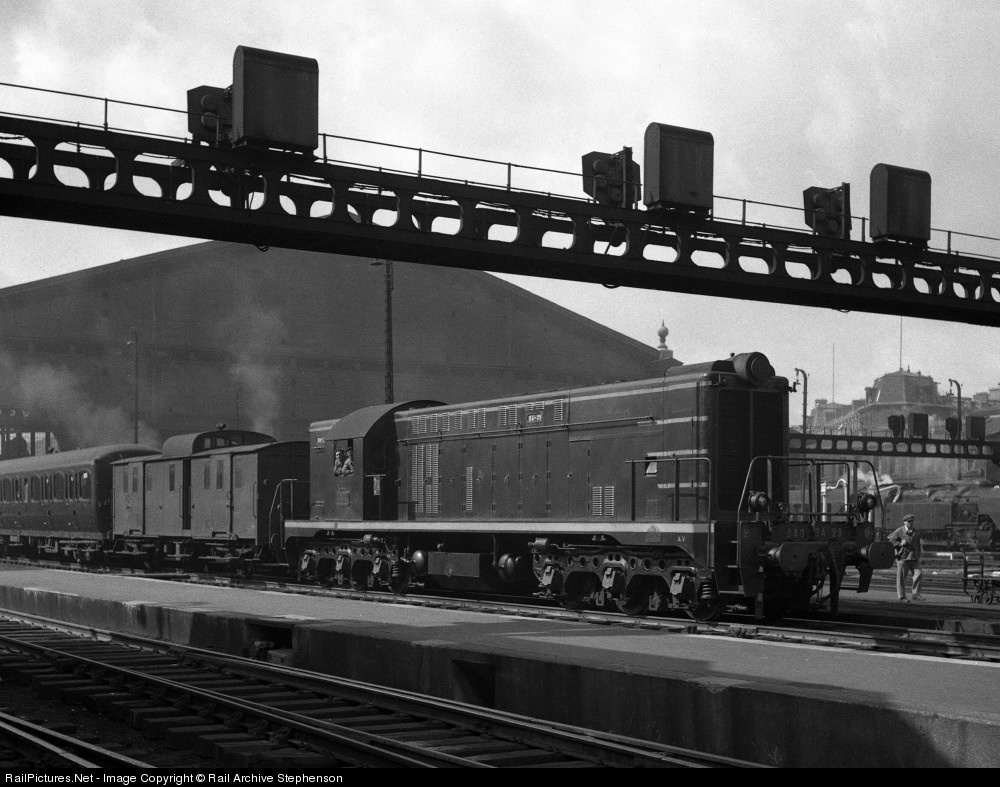 This was one of a hundred diesel-electric A1A-A1A locos built by Baldwin in the USA for the SNCF in 1946-47. It is seen with empty coaching stock that includes a typical French 'Fourgon' and a Nord compartment carriage. Originally numbered in the 040DA ser1es, they were later renumbered BB 62001 to 100. Note the the Nord 141TC suburban 2-8-2T in the background.