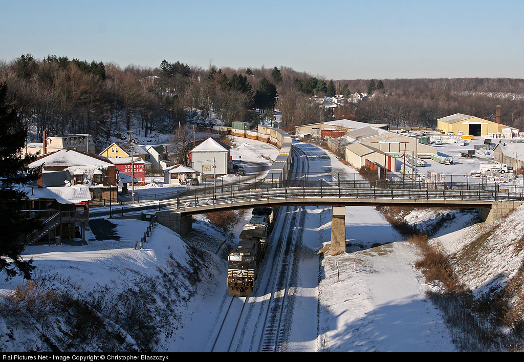 | With Track 1 through the New Portage Tunnel out of service for a couple of hours, we knew that eastbounds would be routed up the steeper Track 2 grade to the Allegheny Tunnel. A long stack train of mostly J.B. Hunt and EMP trailers (symbol help appreciated) slowly cuts through downtown Gallitzin, under the Jackson Street bridge and approaches the west portal of the Allegheny Tunnel. Note the large shadow of a house on the tracks in front of the 9581. |