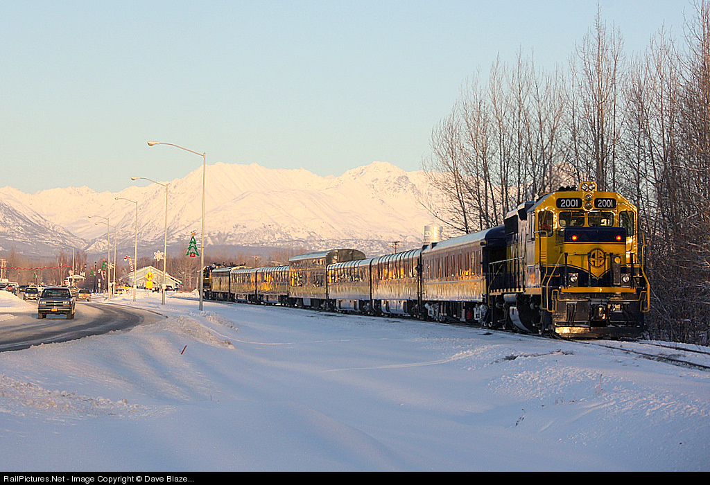 | The ARR's annual Colony Christmas train is just minutes away from arriving at its destination, the historic downtown Palmer Depot. The train made the mile sprint from Anchorage to Matanuska in under an hour then took just over an hour to traverse the 6 mile Palmer Branch. The rails the train is pictured on are normally out of service and this is the only move to traverse it for the entire year. The district roadmaster boarded the head end 1 mile to the south to provide an escort for the final crawl into town. The day is crystal clear and the Talkeetna Moutains shine brightly in the background at the head of the valley. |