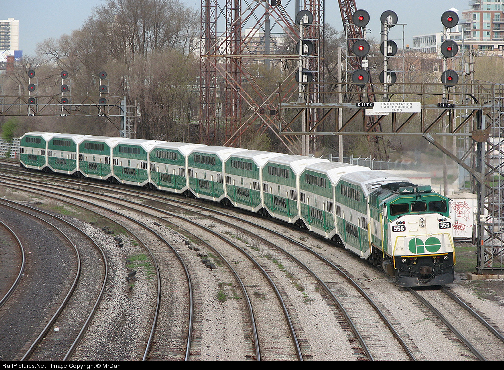 | On a sunny April morning, GO 555 "Triple Nickel" as I've heard crews call her, pushes her consist back to Willowbrook after completing her morning chores bringing sleepy commuters into the city. |