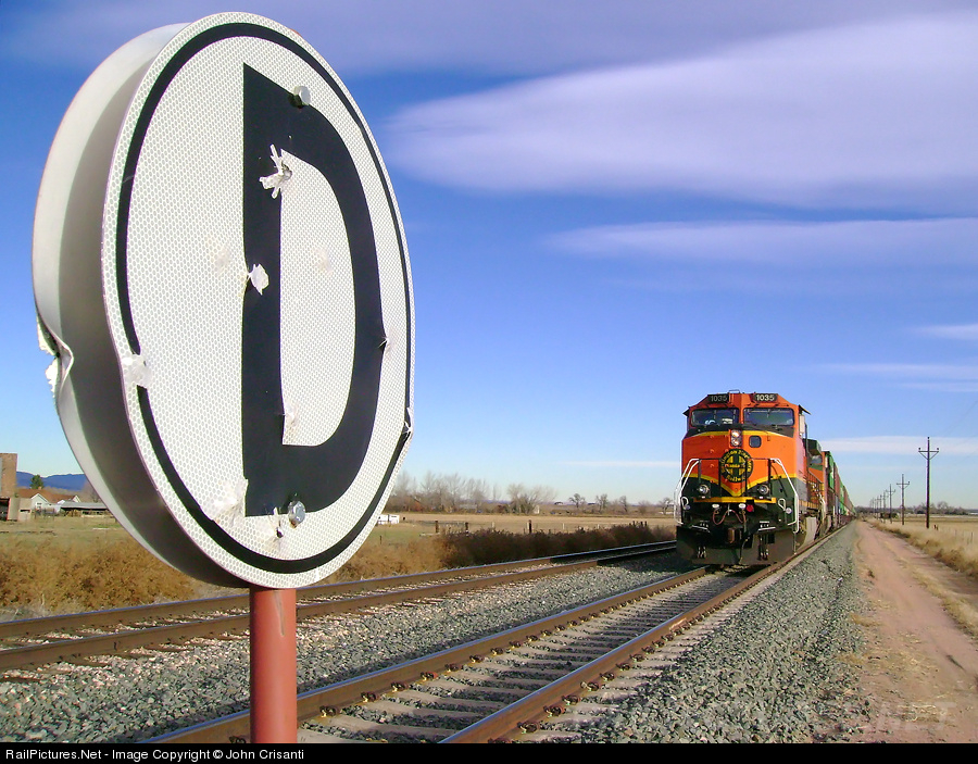 On a bright sunny November morning, BNSF 1035 waits to head south into Denver, Colorado, at Longs Peak. If you notice, the Derail Sign has bullet holes on it. It appears these country folks did some shoot'n. Talk about good TARGET PRACTICE!