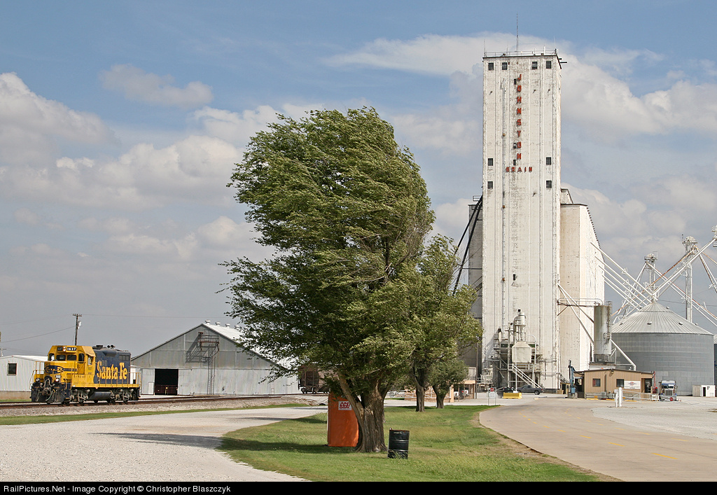 | Can you guess which way the wind blows? One of the surprising things from our trip to Oklahoma last year was the constant winds from the south, as demonstrated by this tree in the shadow of the large W.B. Johnston grain elevator, which 50-year-old GP9 1637 (built as ATSF 734) was in charge of switching. |