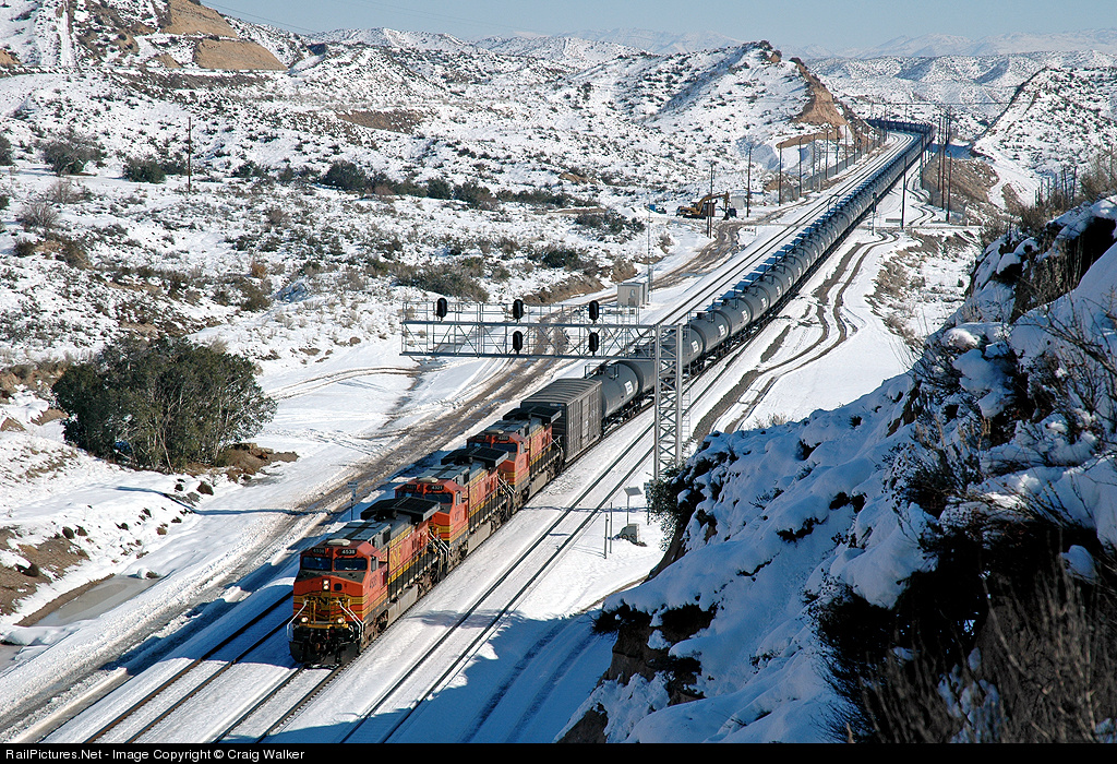 Crossing over to the middle of the three mainlines, BNSF train G-FANWAT7-16A, seen here at the Summit of Califrornia's Cajon Pass, is a unit ethanol train that originated in Fairmont, NE and is bound for Watson, near the ports of Long Beach and Los Angeles. The power is all GE: 4538, 4321 and 4355 up front, with 4067 and 7599 shoving on the rear.