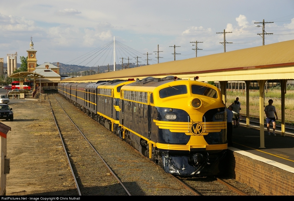 Celebrating the 70th anniversary of the inauguration of the Spirit of Progress Melbourne to Albury, then later Sydney, passenger train, Seymour Railway Heritage Centre's preserved B74 and S303 sit at the broad gauge platform at Albury,resplendent in original VR livery with matching cars, prior to departure to Melbourne in November 2007. This livery was originally based on that of the Erie Railroad.