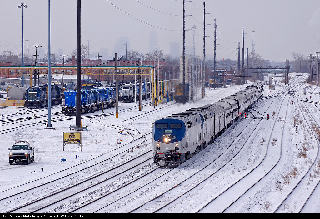 | Running over six hours late, Amtrak's Lake Shore Limited slowly gets out of the city of Cleveland after stopping twice in Collinwood Yard for traffic ahead. Note all of the leasers in the background, as CSX seems to be storing them here at the Collinwood engine shops. |