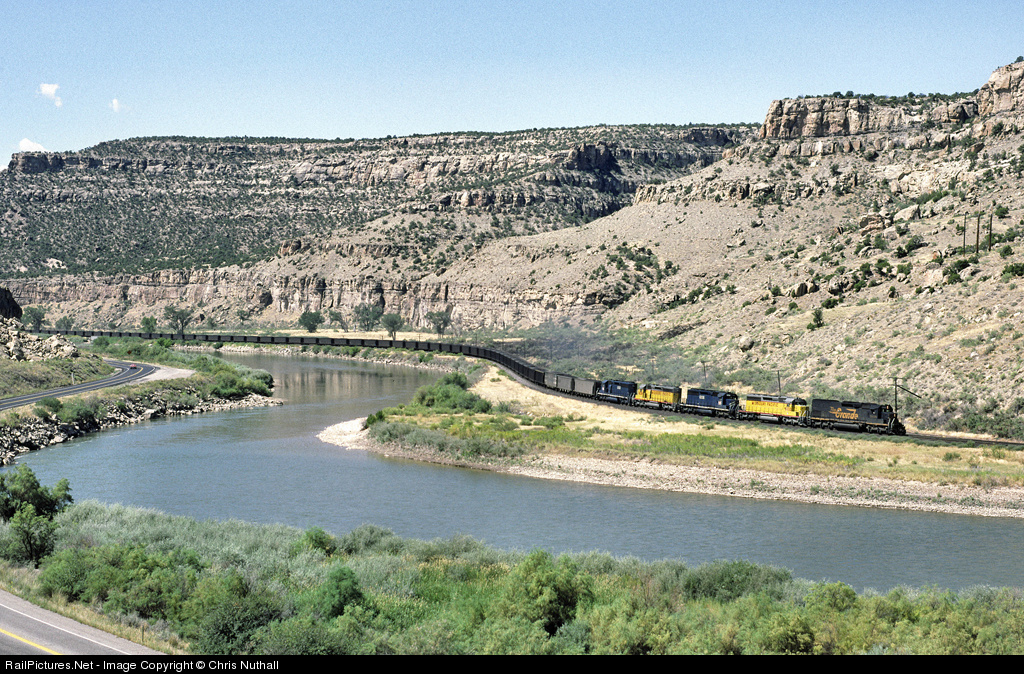 Eastbound coal #788 from nearby Cameo mine follows the Colorado River through De Beque Canyon, east of Grand Junction, behind 5408 and Missouri Pacific 6010 6006 6036 6050 with out of picture helpers 5405 5370 5375 ahead of the caboose at the rear. Two of the Mopac units are already in the transition livery of new owner UP.
