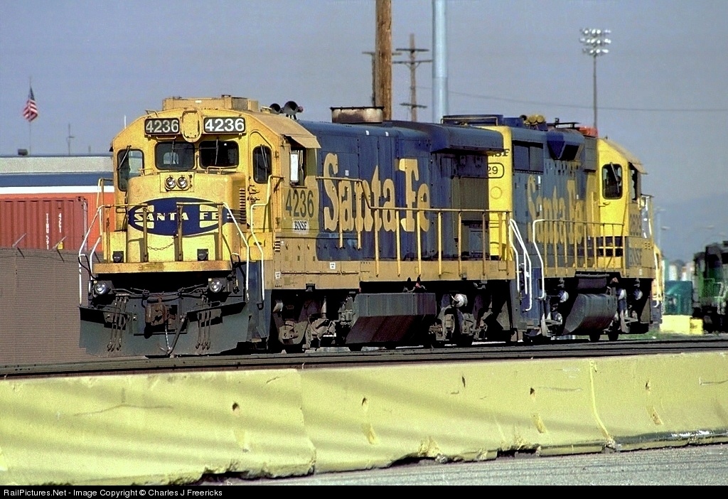 A B23-7 and a GP39-2, still in Santa Fe paint, stand watch over the parade of trucks entering Hobart Yard in Vernon CA. The Jersey barriers are painted yellow to direct tractor trailers through here. BNSF #4236 was delivered to the ATSF by GE Erie as #6379 in June of 1979 (part of Santa Fe's second order for this type of unit... eventually they would order 69 units in four batches). Two years after I snapped this, it was retired, along with the entire fleet of BNSF 4200s on April 1, 2007 and put up for auction.
