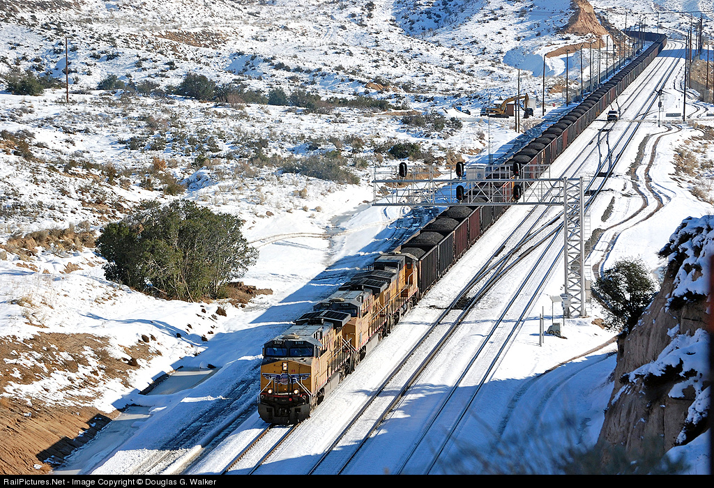 | A Union Pacific coal train, led by 5702, 7296 and 6593 (with 6236 and 4205 shoving on the rear), crests the Summit of Cajon Pass on December 20, 2008. |